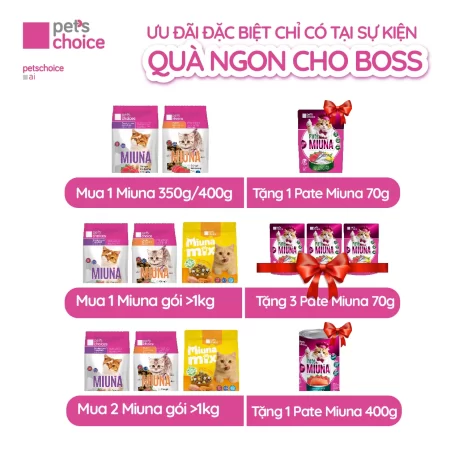 Mua 1 gói Miuna (1.1kg/1.2kg) hoặc Miuna Mix (1kg) -> Tặng ngay 3 gói Pate 70g.