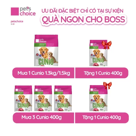 Mua 3 Tặng 1: Khi mua 3 gói Cunio 400g -> Tặng ngay 1 gói cùng loại.